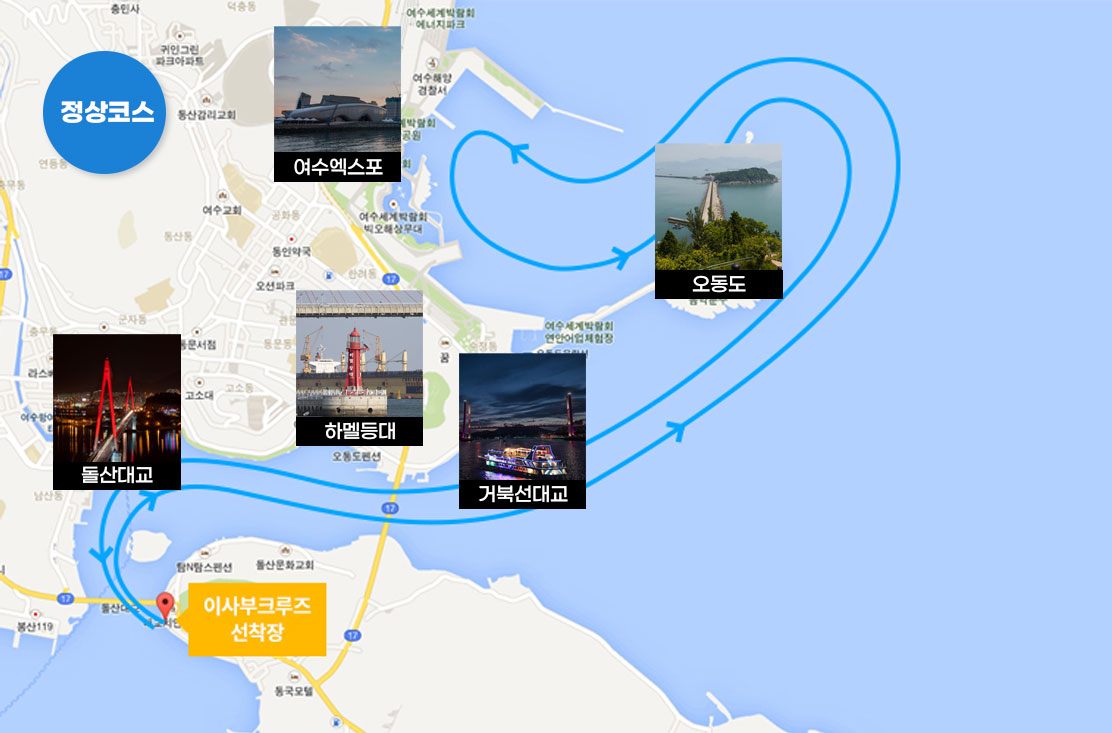 여수 돌산대교 선착장에서 승선하여 여수 바다를 유람하는 크루즈선으로 여수엑스포장, 오동도, 돌산대교, 하멜등대, 거북선 대교 등을 돌아볼 수 있는 유람선.