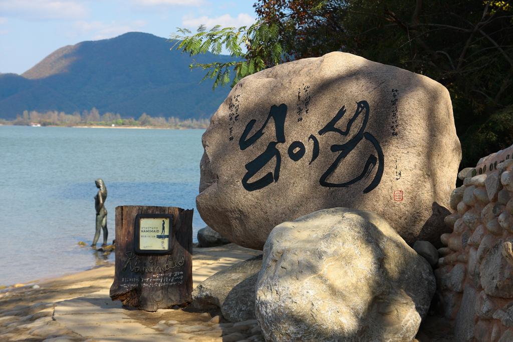 앞섬이라는 뜻의 남섬(南島)으로도 불렸던 남이섬 지명의 유래는 남이섬 북쪽 언덕의 돌무더기에 남이장군이 묻혀있다는 오랜 민간전승에 기인하여 자연스럽게 정착된 것입니다. 다산 정약용의 저서 천우기행(穿牛紀行) 및 산수심원기(汕水尋源記) 등에 따르면 이러한 민간전승 내용과 함께 일찍이 남이섬을 남이섬(南怡苫) 및 남이서(南怡嶼)로 부른 기록을 찾아 볼 수 있습니다. 섬(苫)은 섬을 뜻함이고, 島(도)가 큰 섬을 가리키는데 반해 嶼(서)는 사람이 살 수 없는 작은 섬을 뜻합니다. 수재 민병도 선생은 1965년 남이섬 조성 초기, 남이장군의 넋을 위로하고 장군의 기상을 기리기 위해 돌무더기 주위에 봉분을 쌓고 추모비를 세웠는데, 노산 이은상 선생이 추모 글을 짓고 일중 김충현 선생이 글씨를 썼습니다. 한편 남이장군의 행정상의 진묘는 경기도 화성시 비봉면 남전리에 위치하고 있습니다.