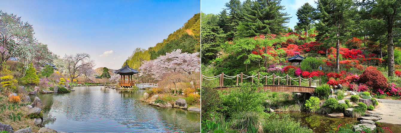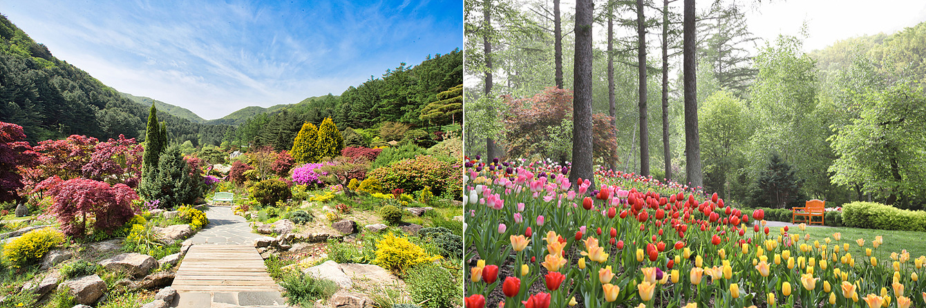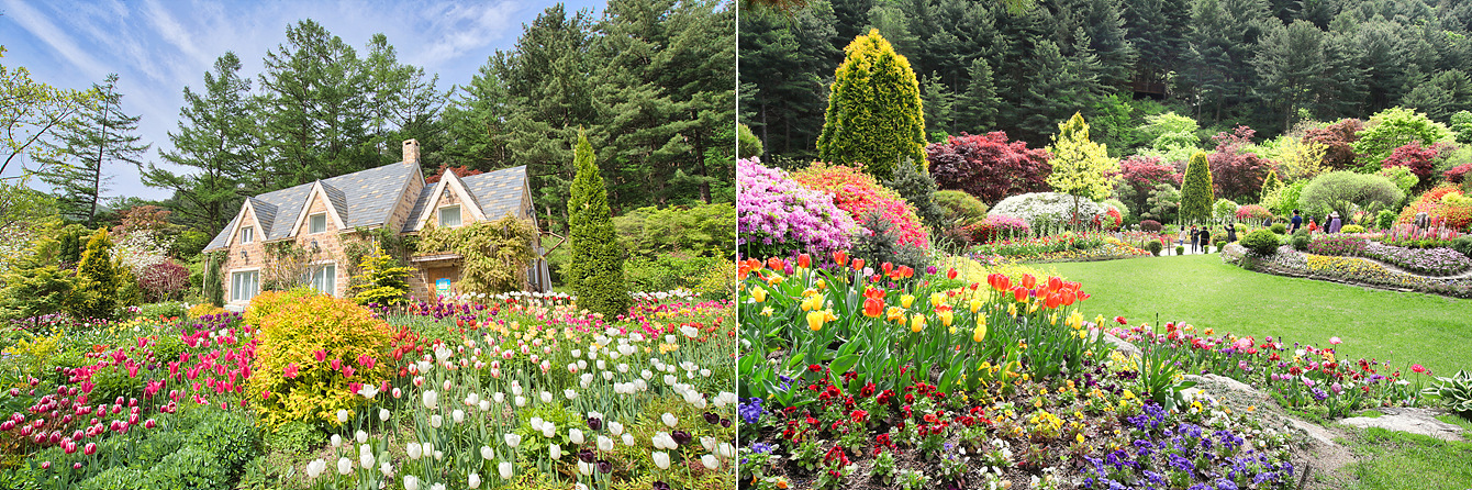 현재 아침고요에서는 약 5,000여 종의 식물을 관람할 수 있고, 총10만평(33만㎡)의 면적에 하경정원, 에덴정원, 아침광장, 하늘길, 분재정원, 한국정원 등 22여개의 특색 있는 주제정원으로 이루어져 있습니다. 산수경온실, 초화온실, 알파인온실 총 3곳의 실내 전시시설을 보유하고 있으며 계절별로 열리는 축제와 야생화・수국・국화 전시회 등의 전시행사를 진행합니다. 이밖에 시가 있는 산책로, 아침고요산책길, 아침계곡, 탑골, 천년향 등의 수려한 자연경관을 감상할 수 있습니다.